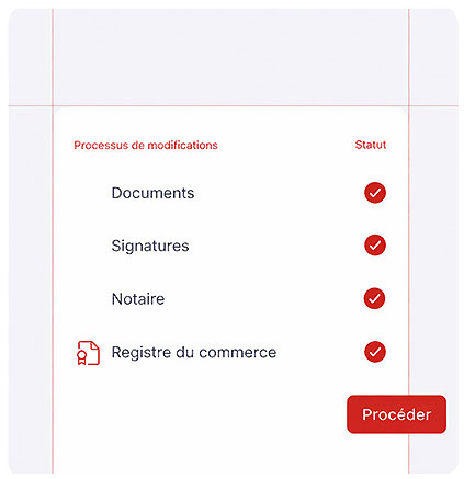 Nous transmettons vos documents signés par voie électronique au registre du commerce du canton concerné, avec une confirmation de réception en quelques minutes. Dès que les modifications sont traitées et validées, nous vous en informons immédiatement.